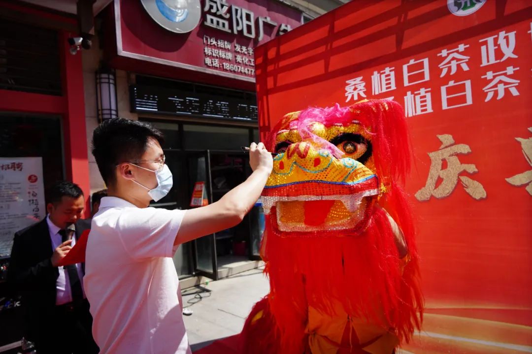 隨后,一陣鏗鏘有力、熱鬧非凡的鑼鼓響起,兩頭金獅在場上翻騰起舞,精彩的舞獅表演將現場的氣氛推向了高潮,吸引了眾多市民駐足觀賞。李中欽先生與湯程霖先生一同為金獅點睛,寓意湘豐桑植白茶行政中心旗艦店鴻運當頭,開業大吉。